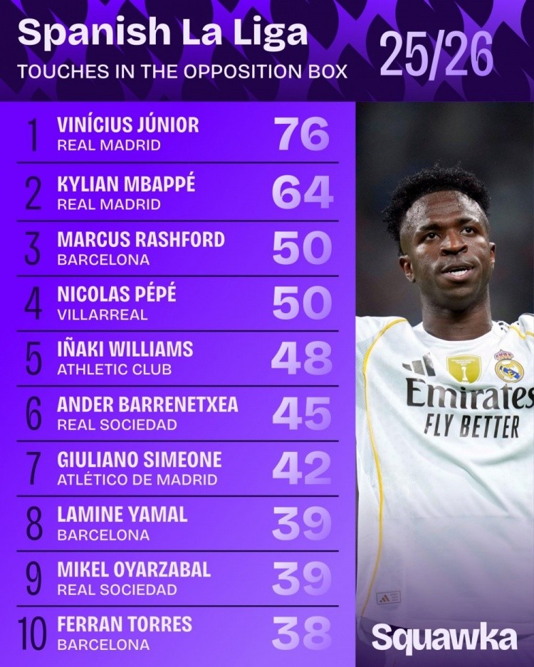 10月7日讯 日前,Squawka统计了本赛季西甲禁区触球次数排行,维尼修斯76次居首,姆巴佩64次第二。